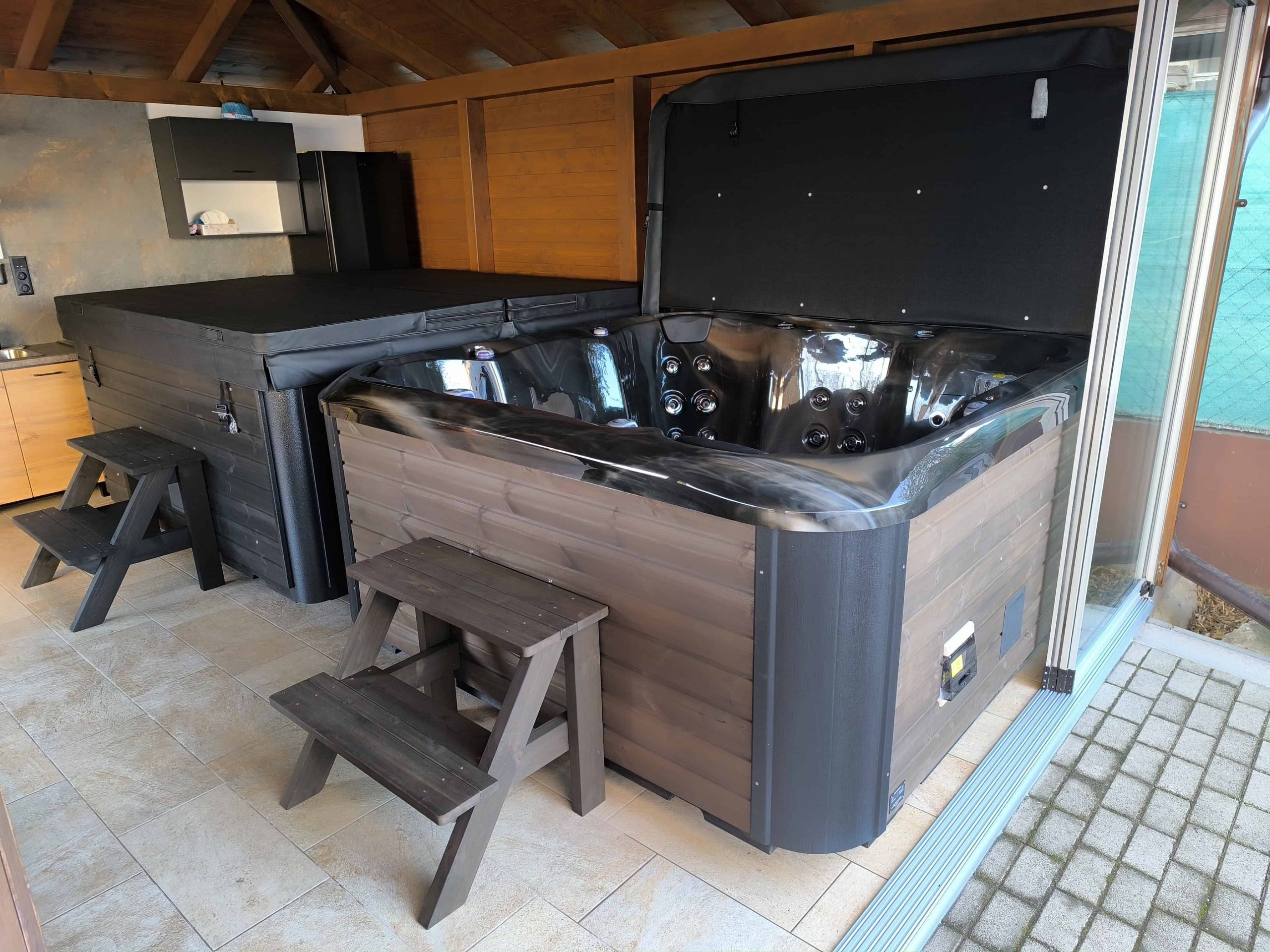 GRANDE - 8 SZEMÉLYES PRÉMIUM NÉGYSZÖG ALAKÚ AKRIL DÉZSAFÜRDŐ, GECKO 3KW ELEKTROMOS FŰTÉSSEL