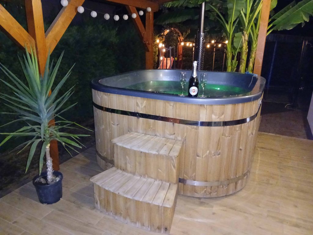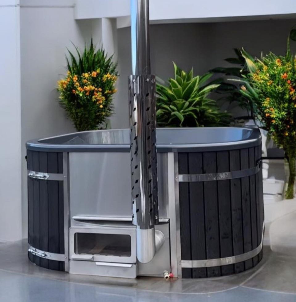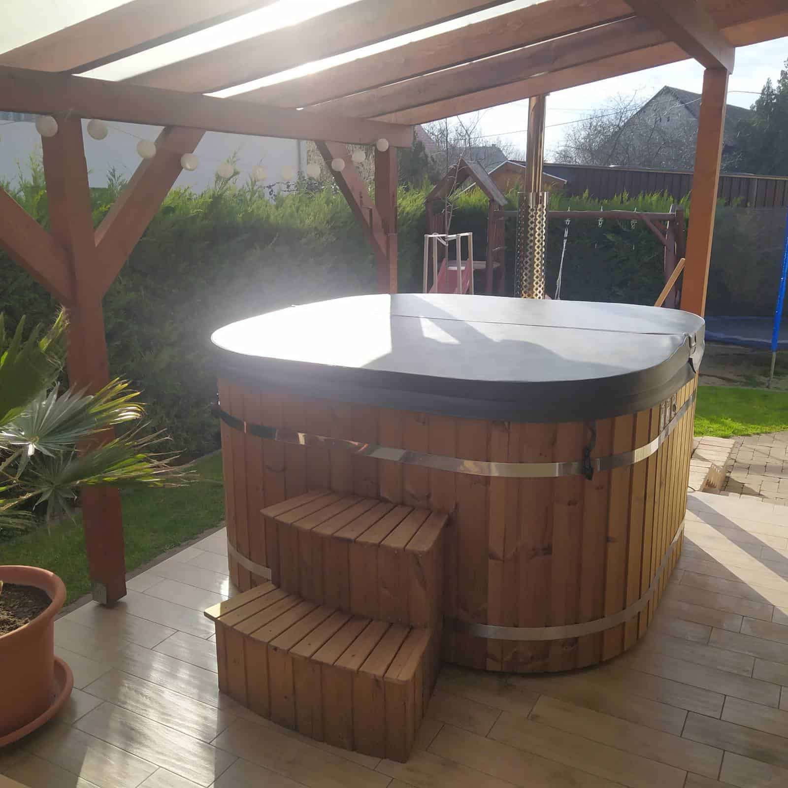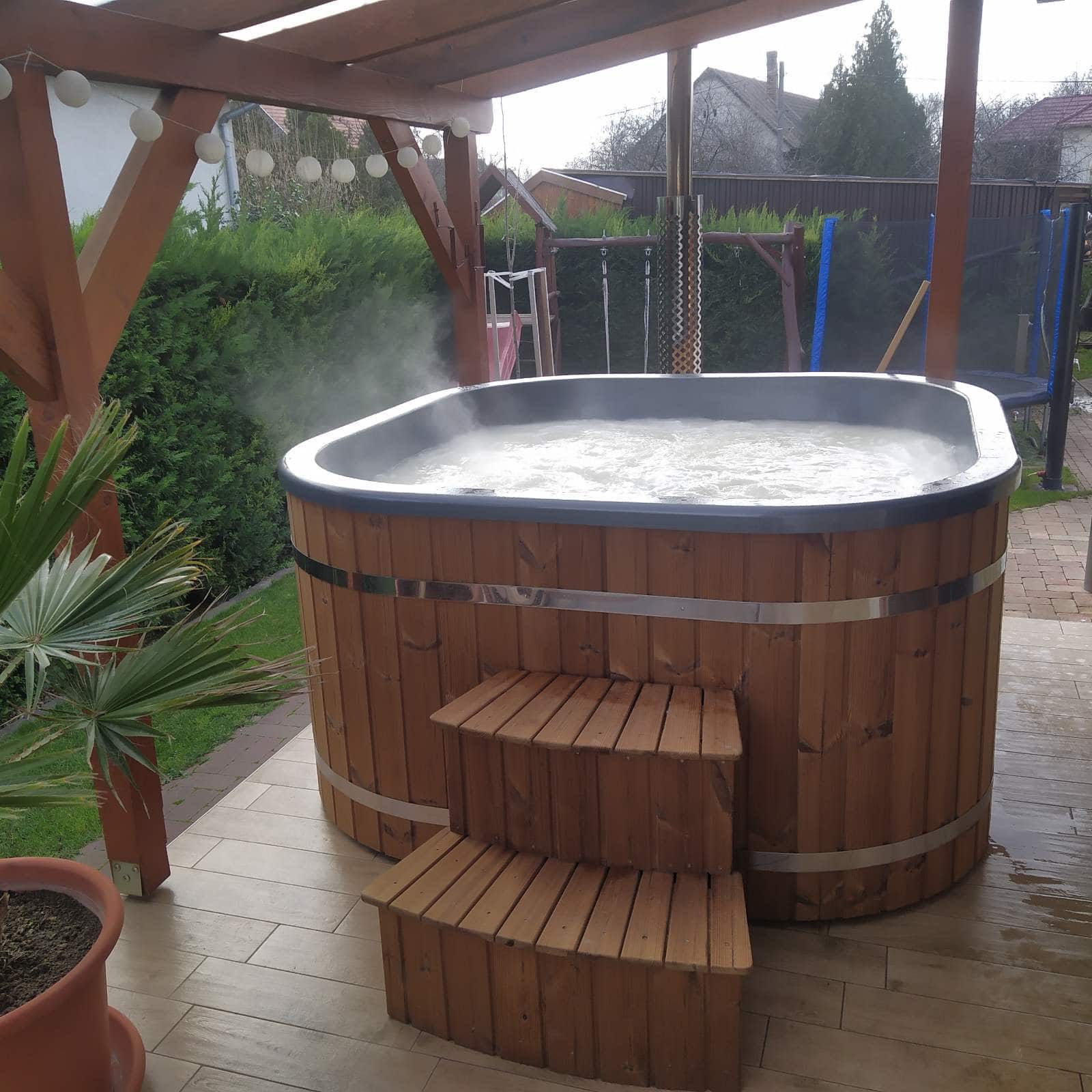 A horizontális integrált kályha nem vesz el egyetlen férőhelyet sem a kád belsejéből, mivel a kád ülőhelye alatt helyezkedik el, így ez egy teljes értékű 8 személyes dézsafürdő.