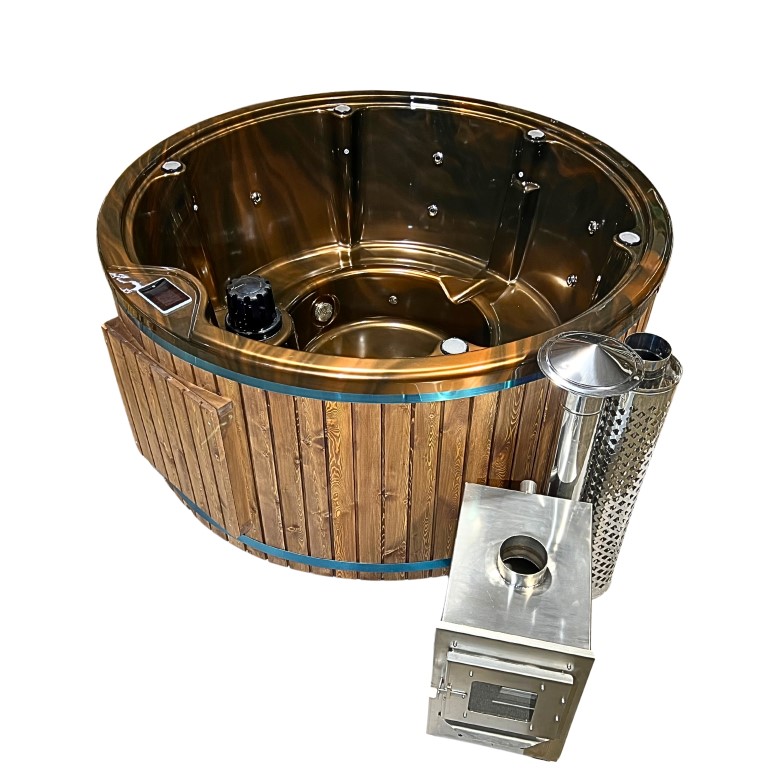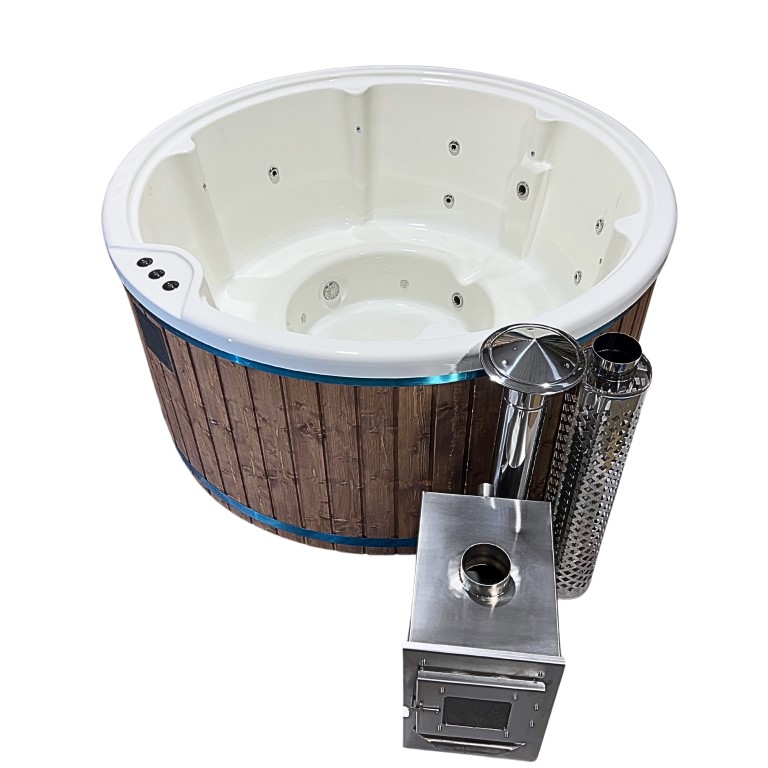 MEGÚJULT LUX IN - 6 SZEMÉLYES PRÉMIUM KÖR ALAKÚ AKRIL DÉZSAFÜRDŐ KÜLSŐ KÁLYHÁS FŰTÉSSEL, SÓZHATÓ KIVITELBEN, MÁRVÁNY SZÍNEKBEN